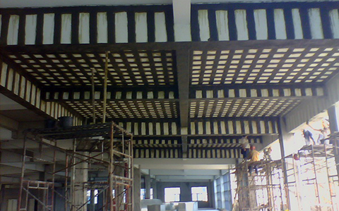 將抗拉強度極高的碳纖維用環(huán)氧樹脂預浸成為復合增強材料(單向連續(xù)纖維);用環(huán)氧樹脂粘結劑沿受拉方向或垂直于裂縫方向粘貼在要補強的結構上,形成一個新的復合體,使增強粘貼材料與原有鋼筋混凝土共同受力增大結構的抗裂或抗剪能力,提高結構的強度、剛度、抗裂性和延伸性。